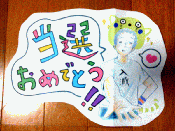 またまた「タラタラしてんじゃねえよ!(激辛味)」駄菓子3つと、かわいい「ポストカード」、「当選おめでとう」イラスト でした~