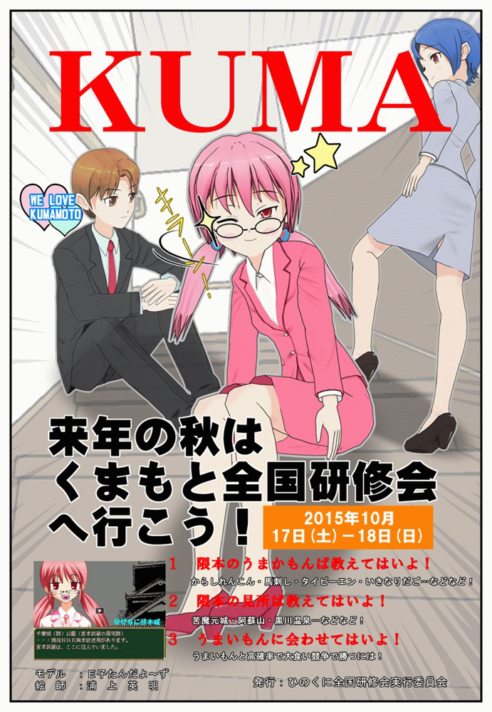 「全青司 熊本全国研修会チラシ (パロディ)」 THE アニメ を作りました! ツイート 本日はこれで失礼します。おやすみなさい。 ちょっと事情があって、全青司(全国青年司法書士協議会)の「熊本全国研修会チラシ」のパロディ版を作りました! まあ、いい加減に作ったものですので、私には面白いですが、 他から見たら、ふざけてるのか!と思われてしまうかもしれませんね。 本日は、過去作4コマをいじることができませんでした(残念!)。